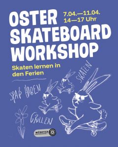 Vom 7.–11. April, jeweils von 14–17 Uhr, besuchen wir gemeinsam verschiedene Skateparks in Münster, üben Grundlagen und Tricks und verbringen eine gute Zeit auf dem Board.